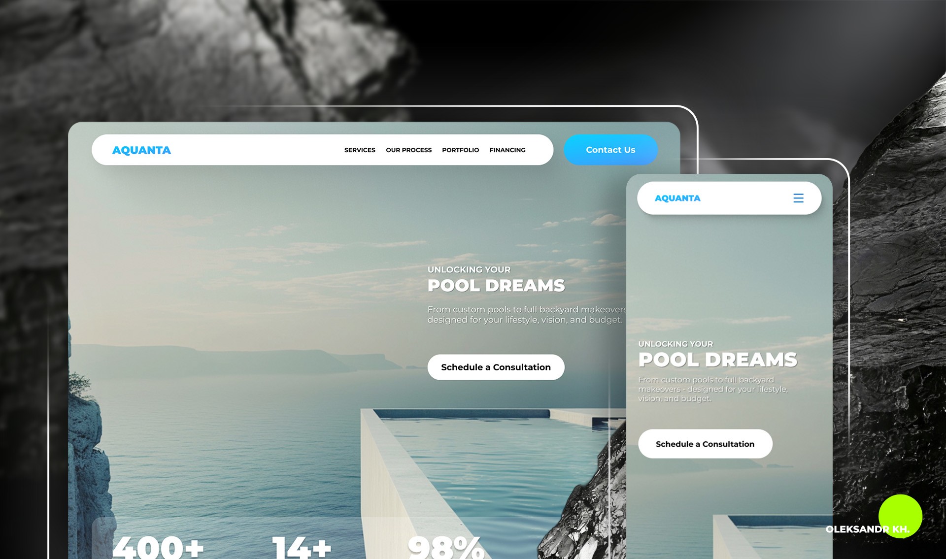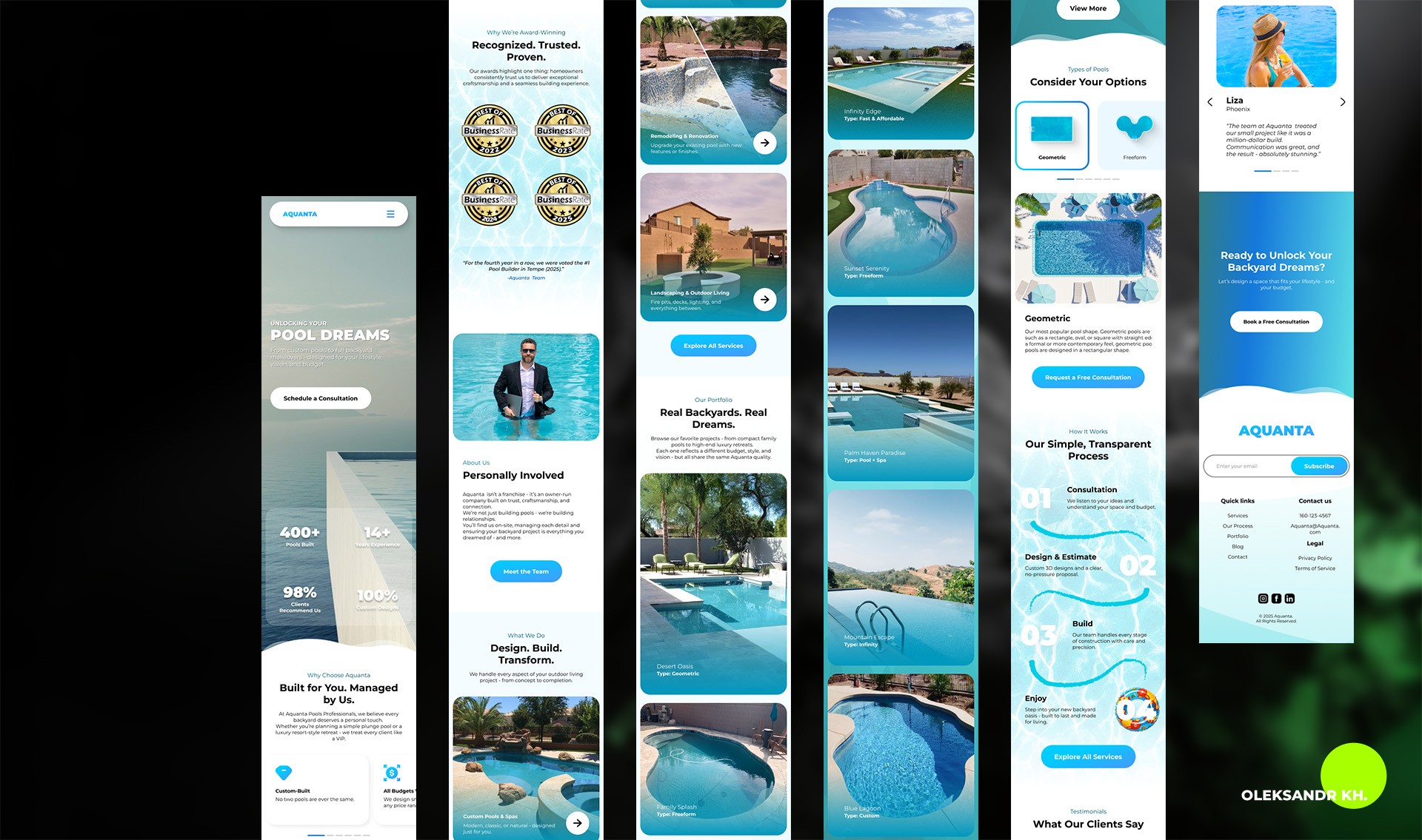 Ich habe eine Website für Aquanta gestaltet, einen Anbieter für Poolbau, Renovierung und Wartung. Das Ziel war, Interessenten schnell zur Beratungsbuchung zu führen, Leistungen als integriertes Service-Ökosystem darzustellen und die Markenwahrnehmung auf ein hochwertiges Niveau zu heben.