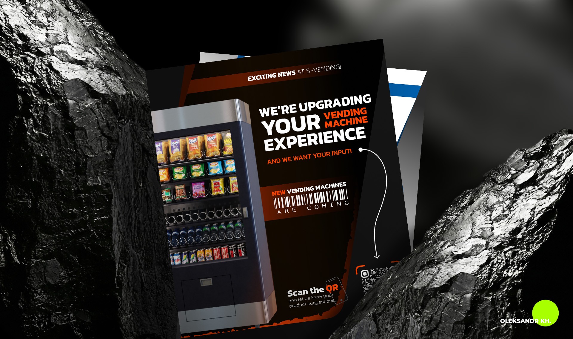 The visual direction was built around contrast, urgency, and technological clarity. I used bold typography, strong diagonal composition, and high-impact color blocking to create immediate visual hierarchy. Two color systems were developed: a black-and-orange version for high attention and a white-and-blue version for cleaner corporate distribution. The design language references industrial equipment and modern interfaces to align with the vending environment.