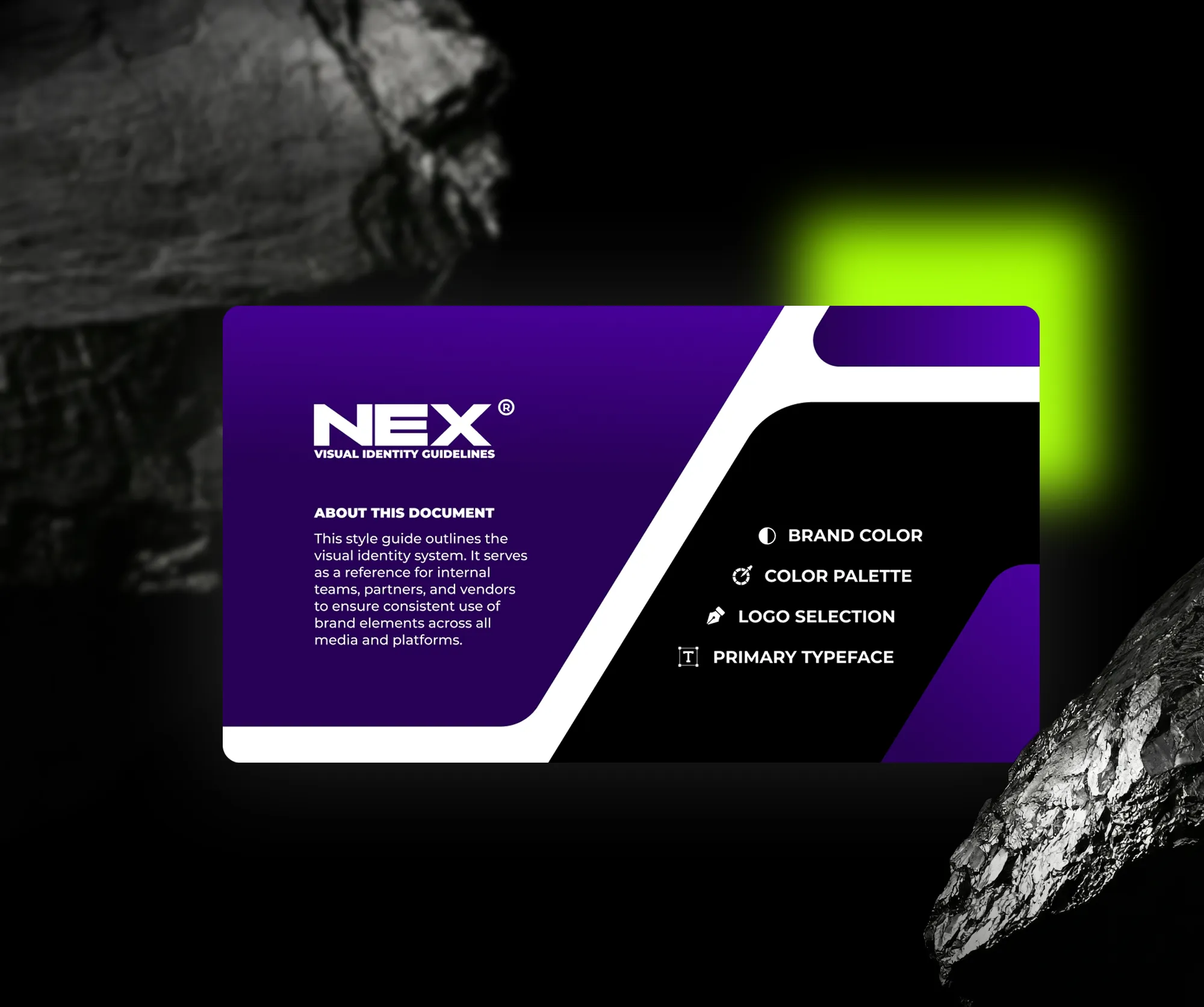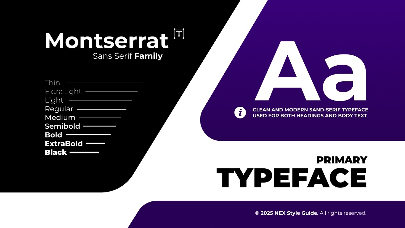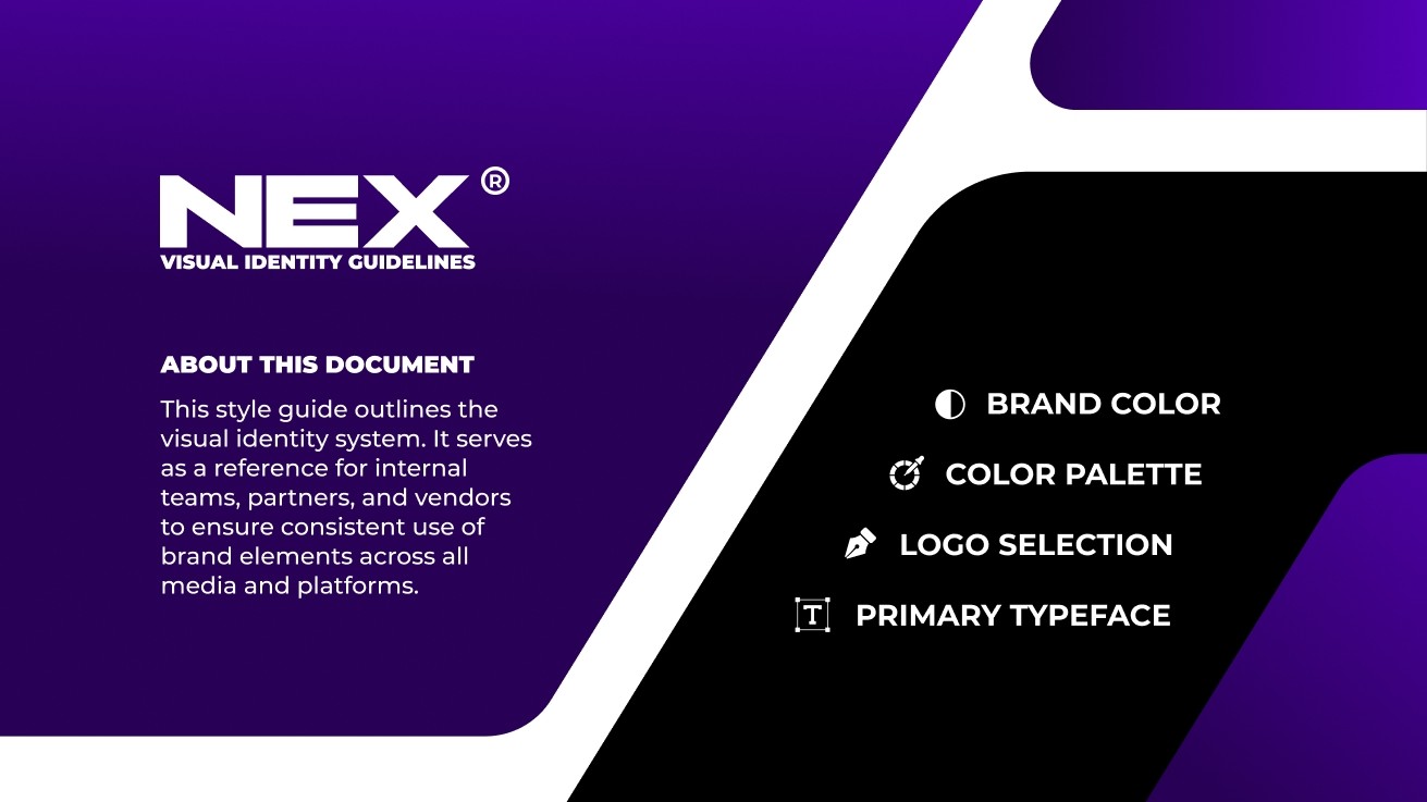 Für NEX wurde ein kompaktes visuelles Leitliniensystem entwickelt, das die zentralen Elemente der Markenidentität definiert. Es umfasst Typografie, Farbpalette und Logoanwendung und dient als praktische Grundlage für eine konsistente Markenkommunikation. Der Fokus liegt auf Klarheit und einfacher Anwendbarkeit, sodass das System schnell verstanden und effizient in verschiedenen digitalen Kontexten eingesetzt werden kann.